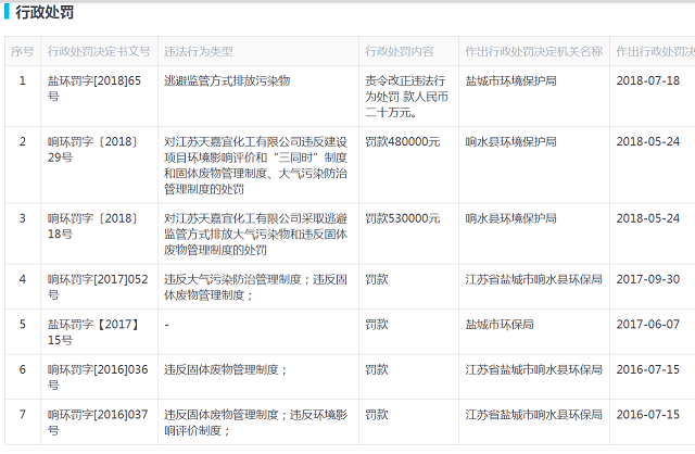 經(jīng)啟信寶查詢,2018年5月24日,天嘉宜化工被響水縣環(huán)境保護局處罰,[響環(huán)罰字〔2018〕29號]決定文書介紹,依據(jù)《建設項目環(huán)境保護管理條例》第二十三條、《中華人民共和國環(huán)境影響評價法》第三十一條、《中華人民共和國大氣污染防治法》第一百零七條、《中華人民共和國固體廢物污染環(huán)境防治法》第七十五條,天嘉宜化工被罰款480000元。最近的一次是2018年7月18日,因逃避監(jiān)管方式排放污染物,被鹽城市環(huán)境保護局責令改正違法行為,并處罰款人民幣20萬元。